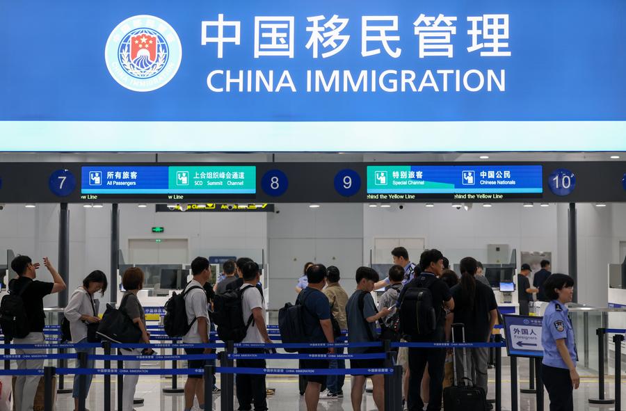 Travelers go through immigration inspection at Terminal 1 of Tianjin Binhai International Airport in north China's Tianjin, Aug. 27, 2025. (Xinhua/Sun Fanyue)