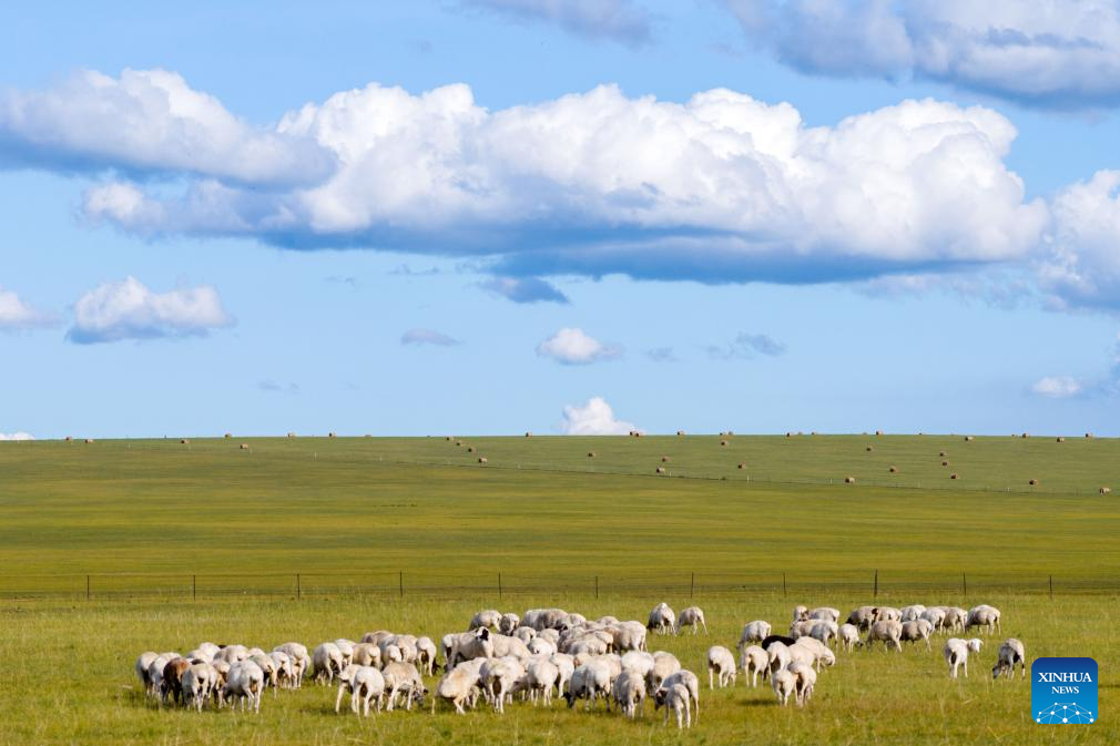 An aerial drone photo taken on Aug. 26, 2025 shows a flock of sheep on the grassland in Hulun Buir, north China's Inner Mongolia Autonomous Region. (Xinhua/Ma Jinrui)
