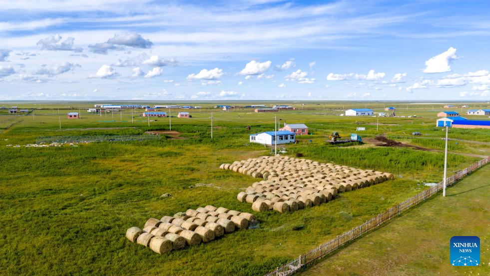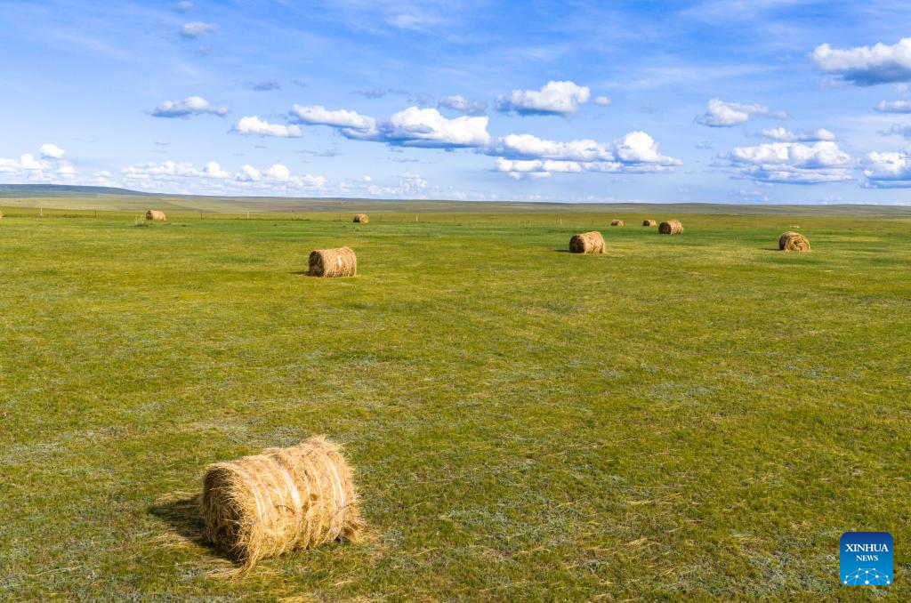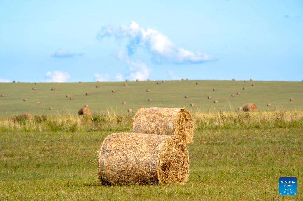 This photo taken on Aug. 26, 2025 shows bundles of hay on the grassland in Hulun Buir, north China's Inner Mongolia Autonomous Region. (Xinhua/Ma Jinrui)