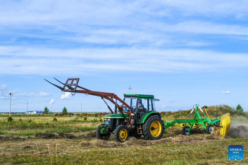 A herdsman drives a mower to collect grass on the grassland in Hulun Buir, north China's Inner Mongolia Autonomous Region, Aug. 26, 2025. (Xinhua/Ma Jinrui)