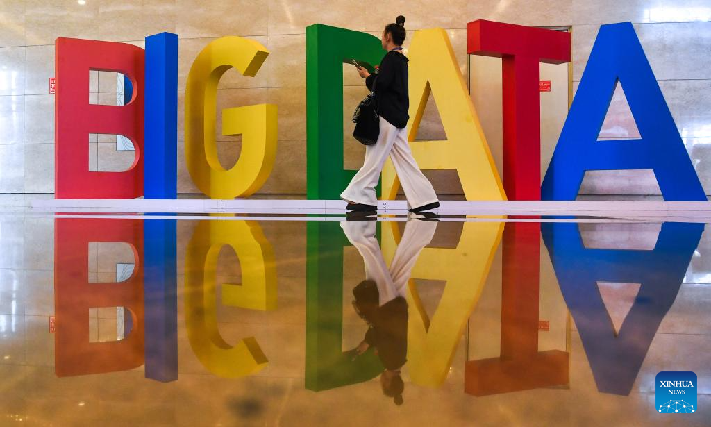 A woman walks past an installation marking the China International Big Data Industry Expo 2025 in Guiyang, southwest China's Guizhou Province, Aug. 28, 2025. The China International Big Data Industry Expo 2025 opened here on Thursday.