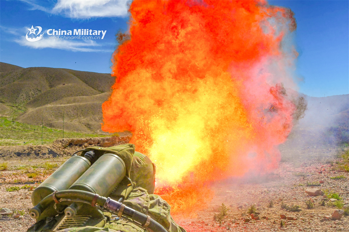 A soldier assigned to a brigade under the Chinese PLA Army ignites controlled fire with a flamethrower against a fire-proof wall during a live-fire training exercise on August 15, 2025. (eng.chinamil.com.cn/Photo by Liao Yixin)