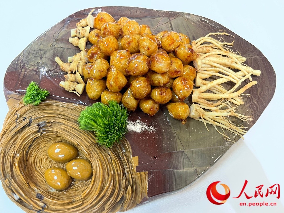 A fragrant creation made with ginseng, fresh shrimp and pagoda tree blossoms, lightly sweetened with honey for a perfect balance of crispiness on the outside and tenderness within at a restaurant in Tonghua, northeast China's Jilin Province. (Photo provided to People's Daily Online)