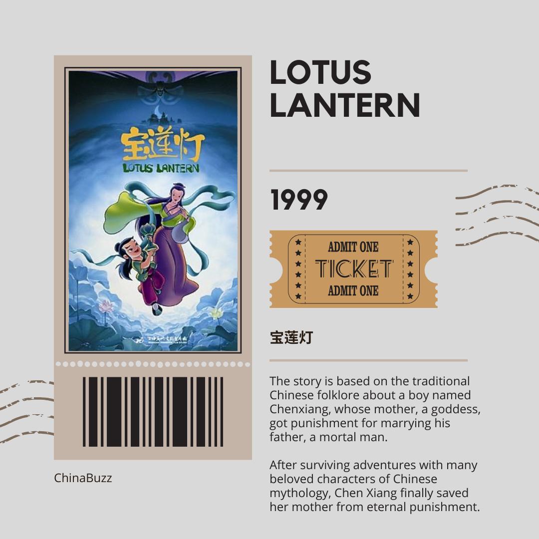 "Lotus Lantern" is a Chinese animated feature film released by Shanghai Animation Film Studio in 1999. The film, based on the Chinese fairy tale The Magic Lotus Lantern, tells the story of Chen Xiang, who goes through immense hardships, seeks out a master to learn martial arts and magic, and finally defeats his uncle Erlang Shen with the help of the Lotus Lantern to rescue his mother.