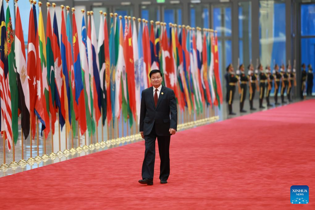 General Secretary of the Lao People's Revolutionary Party Central Committee and Lao President Thongloun Sisoulith arrives at the Meijiang Convention and Exhibition Center for a welcoming banquet in Tianjin, north China, Aug. 31, 2025. Chinese President Xi Jinping and his wife, Peng Liyuan, on Sunday hosted a banquet in China's port city of Tianjin to welcome international guests who are here to attend the Shanghai Cooperation Organization (SCO) Summit 2025. (Xinhua/Ding Haitao)