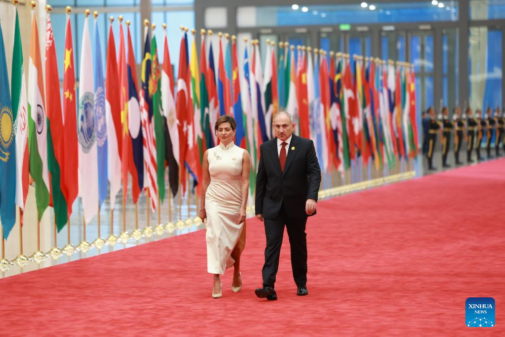 Armenian Prime Minister Nikol Pashinyan and his wife arrive at the Meijiang Convention and Exhibition Center for a welcoming banquet in Tianjin, north China, Aug. 31, 2025. Chinese President Xi Jinping and his wife, Peng Liyuan, on Sunday hosted a banquet in China's port city of Tianjin to welcome international guests who are here to attend the Shanghai Cooperation Organization (SCO) Summit 2025. (Xinhua/Ding Haitao)
