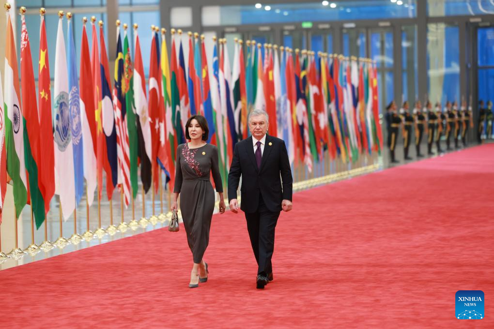 Uzbek President Shavkat Mirziyoyev and his wife arrive at the Meijiang Convention and Exhibition Center for a welcoming banquet in Tianjin, north China, Aug. 31, 2025. Chinese President Xi Jinping and his wife, Peng Liyuan, on Sunday hosted a banquet in China's port city of Tianjin to welcome international guests who are here to attend the Shanghai Cooperation Organization (SCO) Summit 2025. (Xinhua/Ding Haitao)