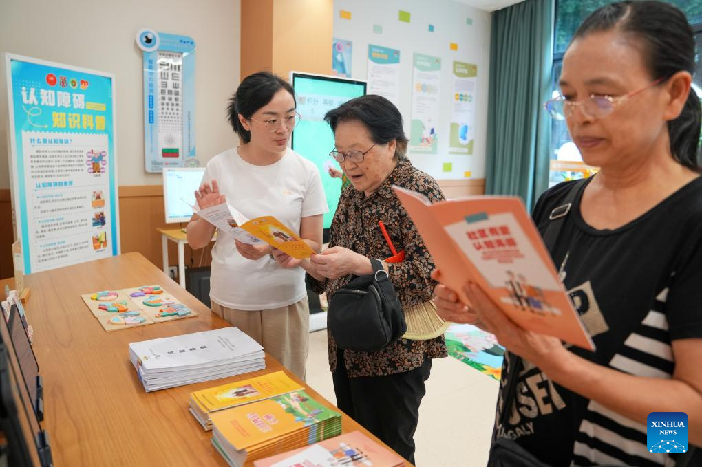 Senior residents learn about cognitive health at a comprehensive elderly care center in Yingmenkou subdistrict of Chengdu, southwest China's Sichuan Province, Sept. 1, 2025. The comprehensive elderly care center covers an area of 1,400 square meters and serves multiple residential communities. Supported by the government and run by enterprise management with social participation, this community-based elderly care complex offers full-time care, daycare, rehabilitation therapies, and professional nursing services. (Xinhua/Jiang Hongjing)