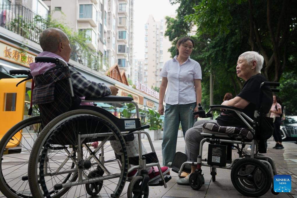 A staff member (C) talks to senior residents in front of a comprehensive elderly care center in Yingmenkou subdistrict of Chengdu, southwest China's Sichuan Province, Sept. 1, 2025. The comprehensive elderly care center covers an area of 1,400 square meters and serves multiple residential communities. Supported by the government and run by enterprise management with social participation, this community-based elderly care complex offers full-time care, daycare, rehabilitation therapies, and professional nursing services. (Xinhua/Jiang Hongjing)