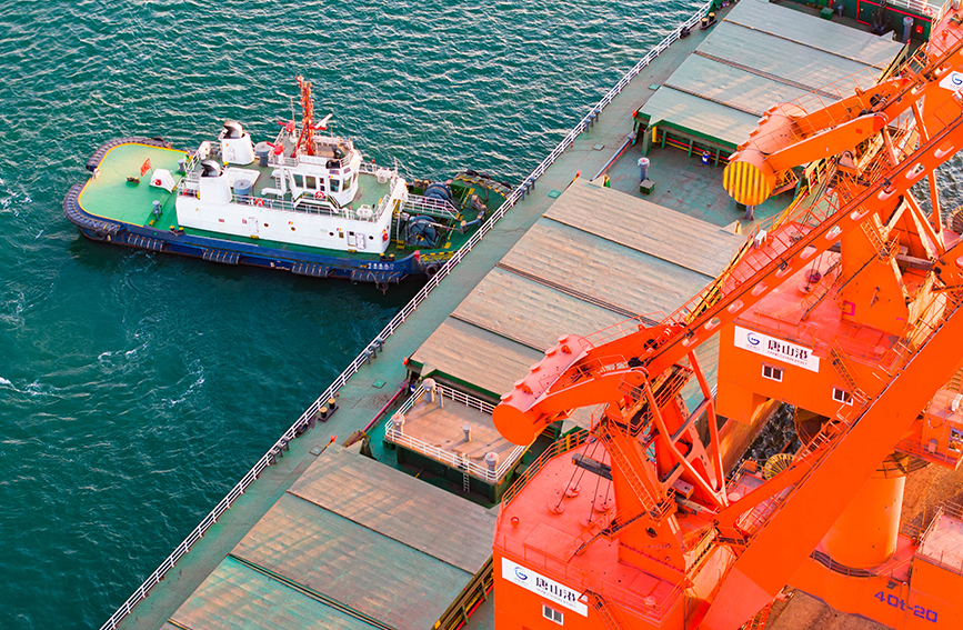 A cargo ship docks at the ore terminal in the Jingtang port area of Tangshan Port, Hebei Port Group, Tangshan, north China's Hebei Province. (Photo courtesy of Hebei Port Group)