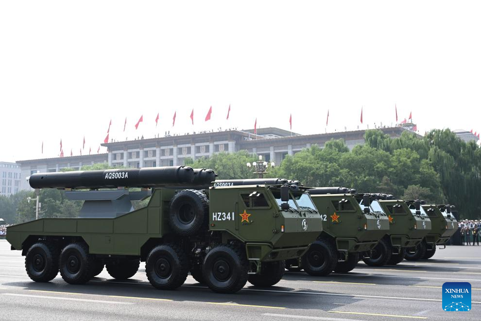 The underwater weaponry formation attends a parade during a grand gathering to commemorate the 80th anniversary of the victory in the Chinese People's War of Resistance against Japanese Aggression and the World Anti-Fascist War in Beijing, capital of China, Sept. 3, 2025. (Xinhua/Yang Guanyu)