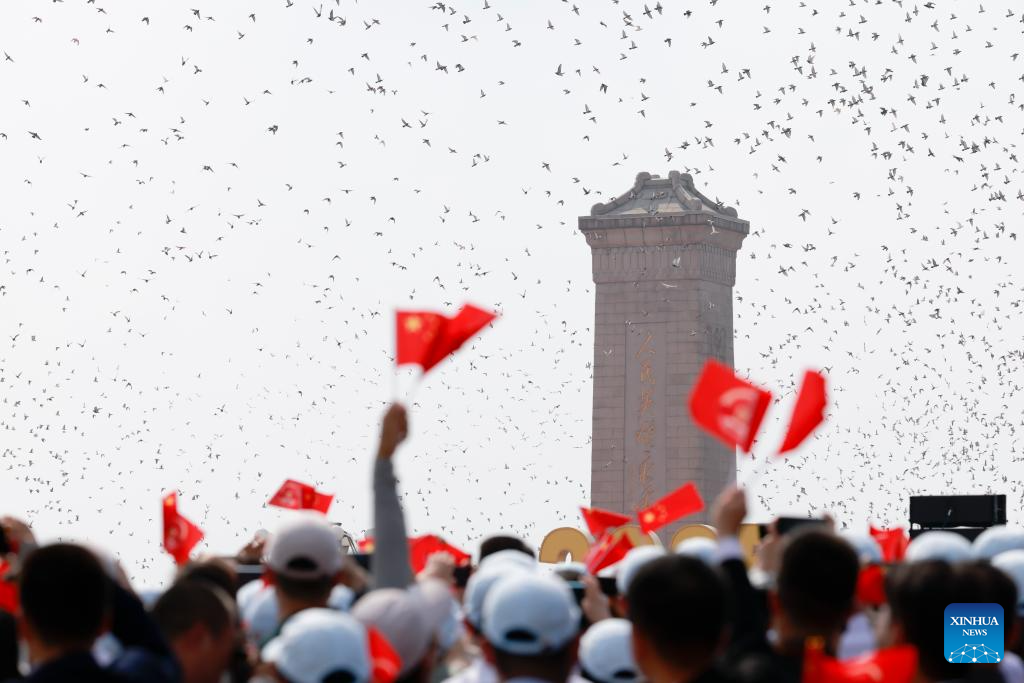 Pigeons are released during a grand gathering to commemorate the 80th anniversary of the victory in the Chinese People's War of Resistance against Japanese Aggression and the World Anti-Fascist War in Beijing, capital of China, Sept. 3, 2025. (Xinhua/Wang Fei)