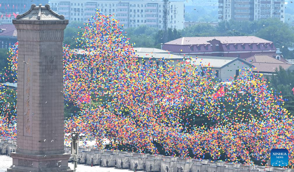 Pigeons and balloons are released during a grand gathering to commemorate the 80th anniversary of the victory in the Chinese People's War of Resistance against Japanese Aggression and the World Anti-Fascist War in Beijing, capital of China, Sept. 3, 2025. (Xinhua/Ma Ning)
