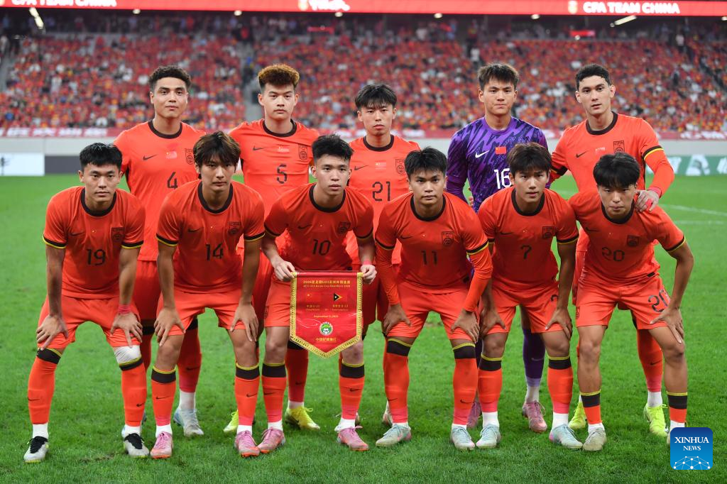 Players of China pose for photos before the AFC U23 Asian Cup Qualifiers Group D football match between China and Timor-Leste in Xi'an, northwest China's Shaanxi Province, Sept. 3, 2025. (Xinhua/Zhang Bowen)