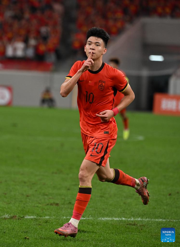 Wang Yudong of China celebrates his goal during the AFC U23 Asian Cup Qualifiers Group D football match between China and Timor-Leste in Xi'an, northwest China's Shaanxi Province, Sept. 3, 2025. (Xinhua/Zou Jingyi)