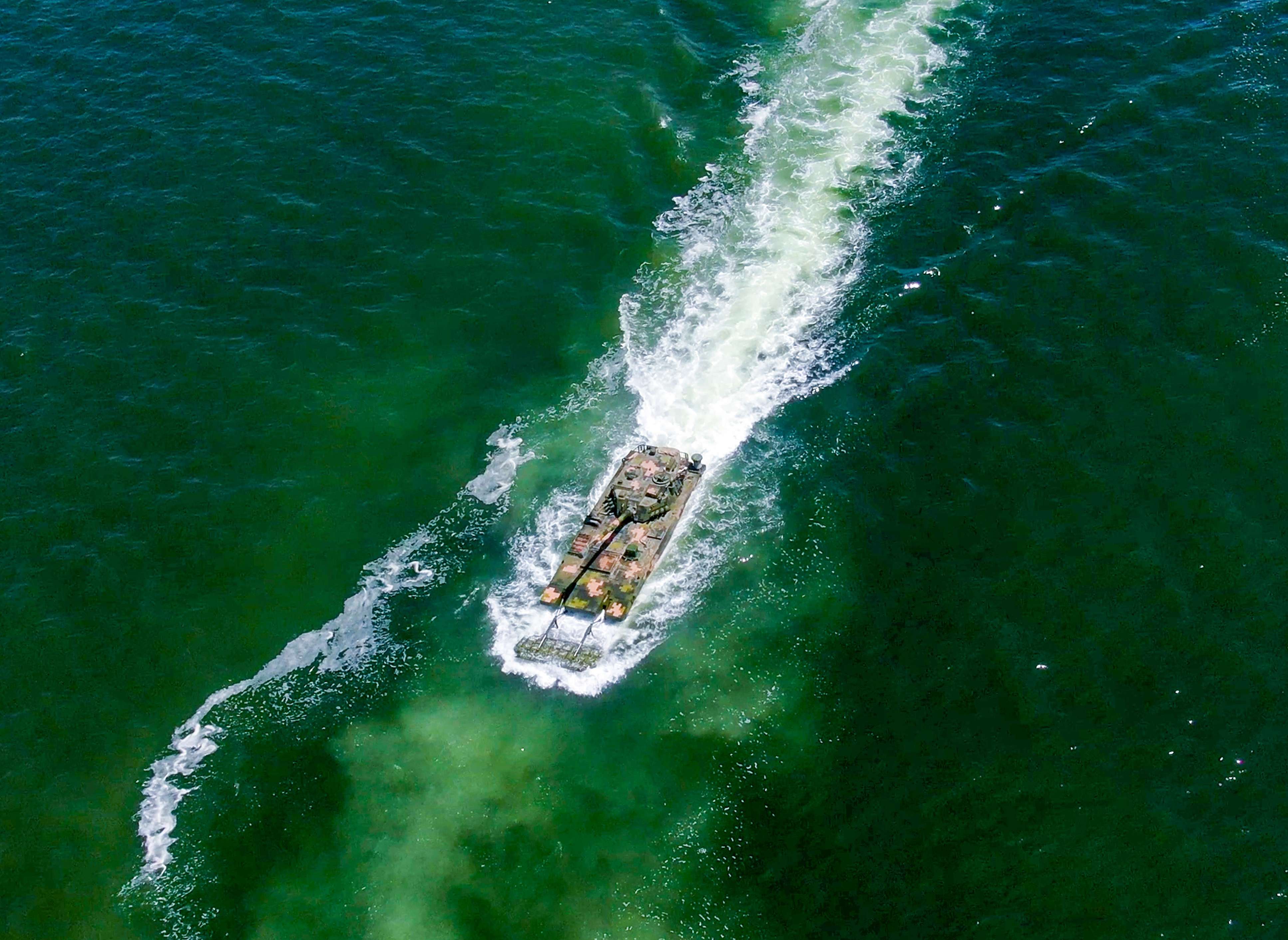 Amphibious armored infantry fighting vehicles (IFVs) attached to a brigade under the Chinese PLA Army maneuver towards the designated sea area during a ferrying and assault wave formation training exercise. (eng.chinamil.com.cn/Photo by Zhang Mao)