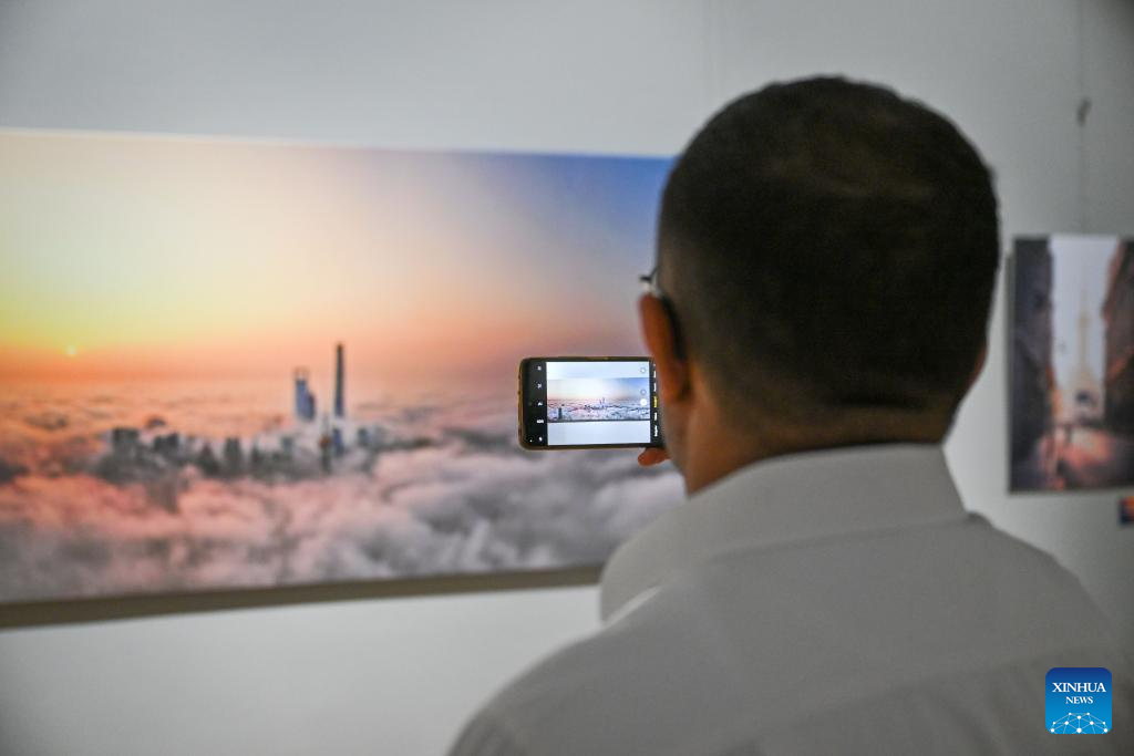 A visitor takes photos at the "Amazing Shanghai" City Branding Campaign and Shanghai-Istanbul Visual Arts Exhibition in Istanbul, Trkiye, Sept. 5, 2025. The "Amazing Shanghai" City Branding Campaign and Shanghai-Istanbul Visual Arts Exhibition was held in Istanbul on Friday. The event brought together nearly a hundred works of photography, illustrations and videos from artists of both China and Trkiye, showcasing urban landscapes and cultural essence of the two port cities. (Xinhua/Liu Lei)