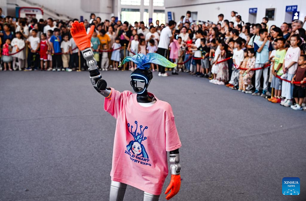 A humanoid robot interacts with visitors during the World Smart Industry Expo 2025 in southwest China's Chongqing Municipality, Sept. 7, 2025. The World Smart Industry Expo 2025 kicked off on Friday in Chongqing, showcasing various humanoid robots at the event. (Xinhua/Wang Quanchao)