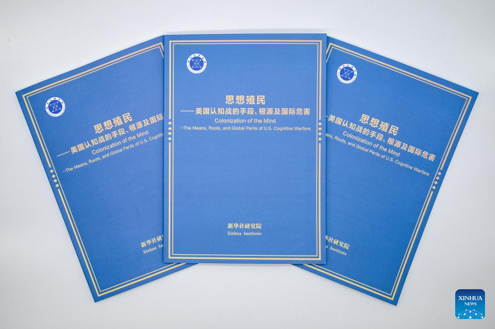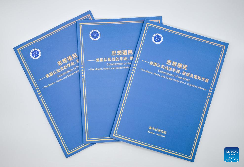 This undated photo shows copies of the think tank report "Colonization of the Mind -- The Means, Roots, and Global Perils of U.S. Cognitive Warfare." The Xinhua Institute, a think tank affiliated with Xinhua News Agency, has released a report titled "Colonization of the Mind -- The Means, Roots, and Global Perils of U.S. Cognitive Warfare," providing an in-depth analysis of the historical facts, the complex operational system, and far-reaching global perils of the U.S. mental colonization. The report, released during the Global South Media and Think Tank Forum 2025 on Sunday, called on all countries, especially those in the Global South, to break off the shackles of mind, regain cultural confidence, and draw a diverse map of civilizations. (Xinhua/Chen Yehua)