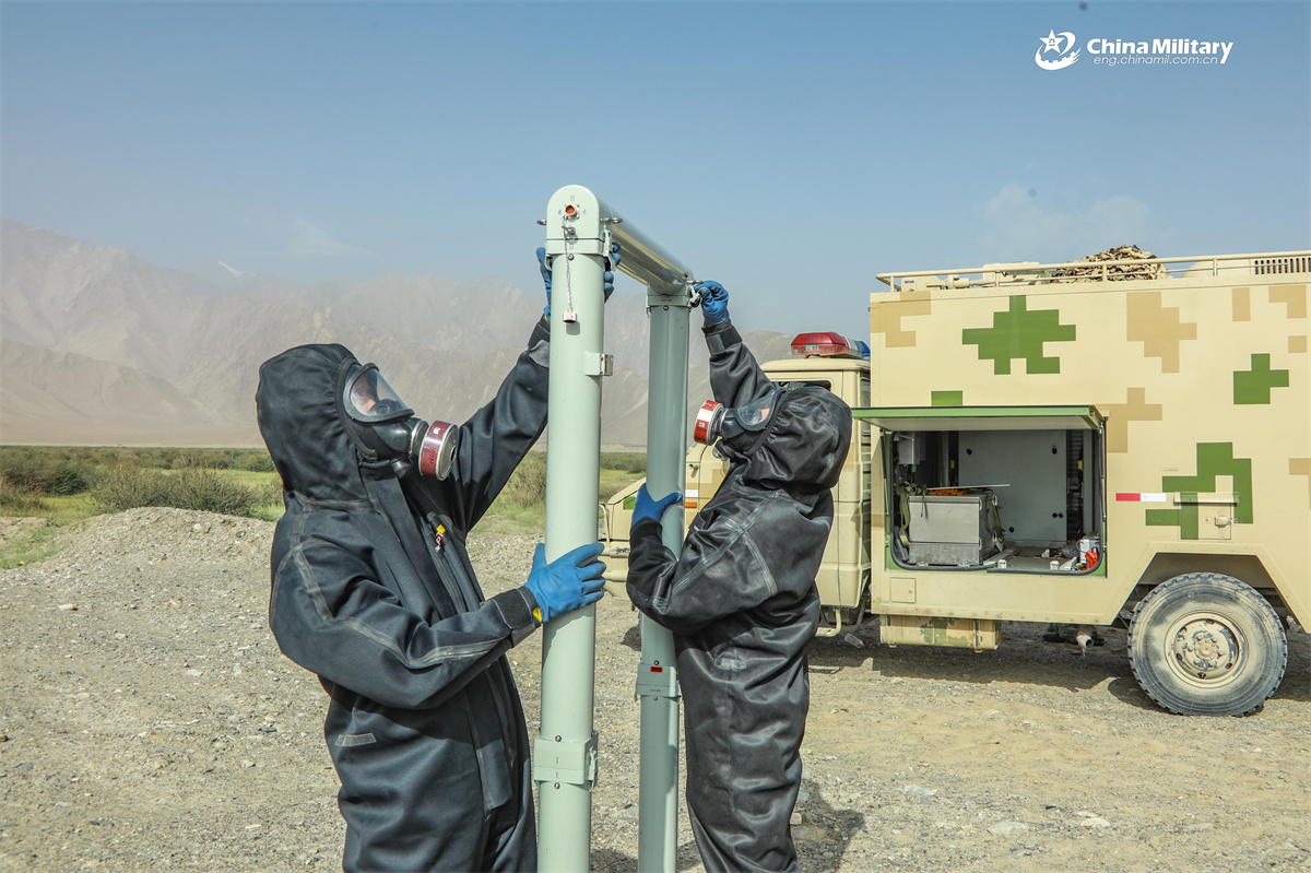 Soldiers assigned to a chemical defense unit under the Chinese PLA Xinjiang Military Command set up a toxicant detecting device during a chemical detection and reconnaissance training exercise on August 28, 2025.(eng.chinamil.com.cn/Photo by Zeng Cunjun)