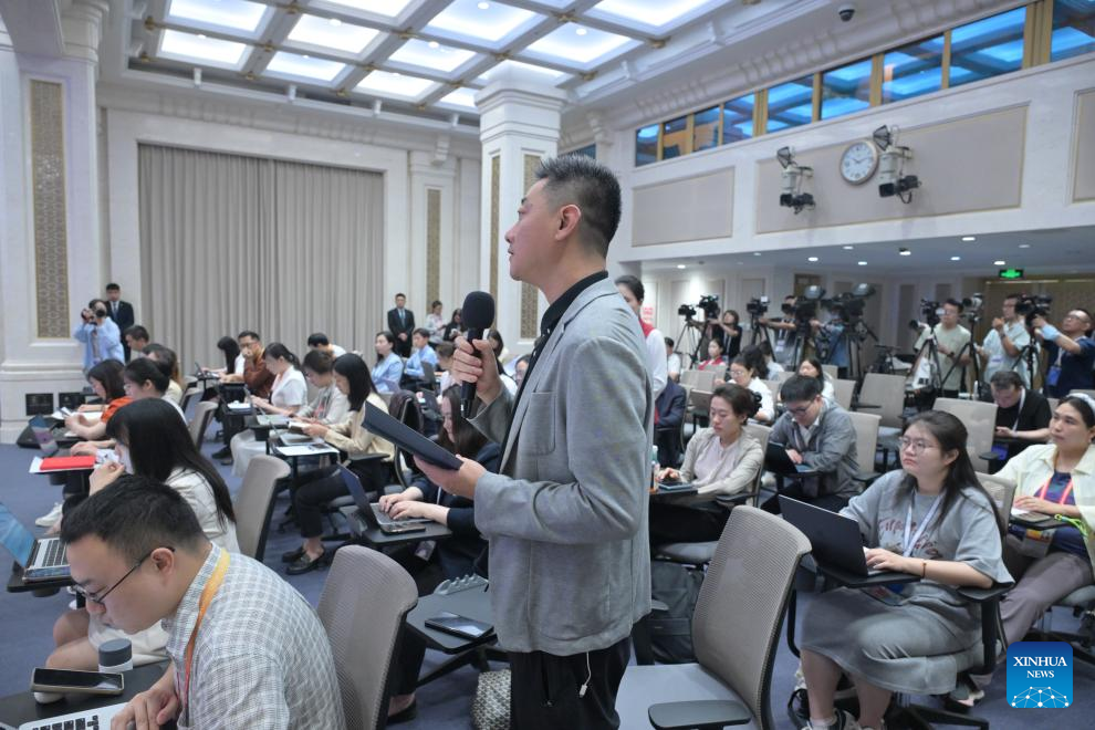 A journalist asks questions at a press conference held by the State Council Information Office (SCIO) on achievements in high-quality natural resources development during the 14th Five-Year Plan period (2021-2025) in Beijing, capital of China, Sept. 10, 2025. (Xinhua/Cai Yang)