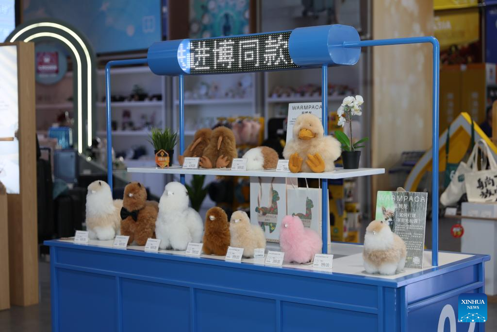 Stuffed toy alpacas are displayed at the Hongqiao Import Commodities Expo and Trade Center in Shanghai, east China, Sept. 9, 2025. (Xinhua/Wang Xiang)