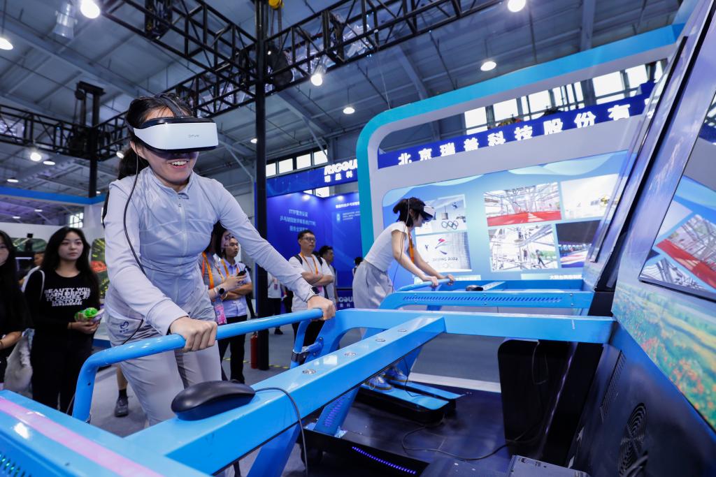 Visitors experience VR skiing during the 2025 China International Fair for Trade in Services (CIFTIS) in Beijing, capital of China, Sept. 10, 2025. (Xinhua/Chang Nengjia)