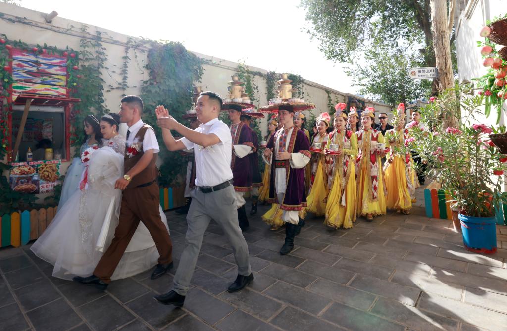 Performers participate in a wedding ceremony in the Qiuci Alley of Kuqa City, northwest China's Xinjiang Uygur Autonomous Region, July 22, 2025. In the Qiuci Alley of Kuqa City, northwest China's Xinjiang Uygur Autonomous Region, Parhat Emin performs the Samawar (a Uygur term meaning "tea set") dance, a traditional Uygur greeting dance with a history dating back to the millennium-old ancient Qiuci State. His eyes shine brightly, and his smile is warm and welcoming. With a bronze pot and porcelain bowls balanced steadily on a plate over his head, his body spins smoothly, and his feet move as lightly as the wind. As he dances gracefully to the rhythm of traditional Uygur music, the surrounding audience burst into cheers from time to time. (Xinhua/Wang Fei)