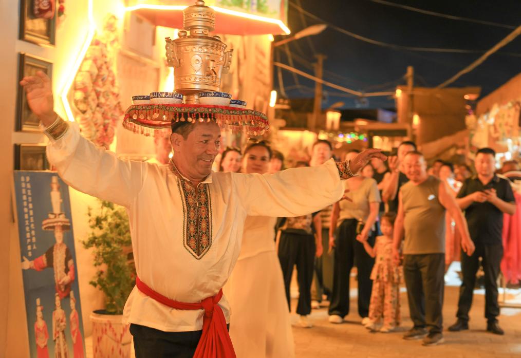 This photo shows a view of the Qiuci Alley of Kuqa City, northwest China's Xinjiang Uygur Autonomous Region, July 22, 2025. In the Qiuci Alley of Kuqa City, northwest China's Xinjiang Uygur Autonomous Region, Parhat Emin performs the Samawar (a Uygur term meaning "tea set") dance, a traditional Uygur greeting dance with a history dating back to the millennium-old ancient Qiuci State. His eyes shine brightly, and his smile is warm and welcoming. With a bronze pot and porcelain bowls balanced steadily on a plate over his head, his body spins smoothly, and his feet move as lightly as the wind. As he dances gracefully to the rhythm of traditional Uygur music, the surrounding audience burst into cheers from time to time. (Xinhua/Wang Jingqiang)