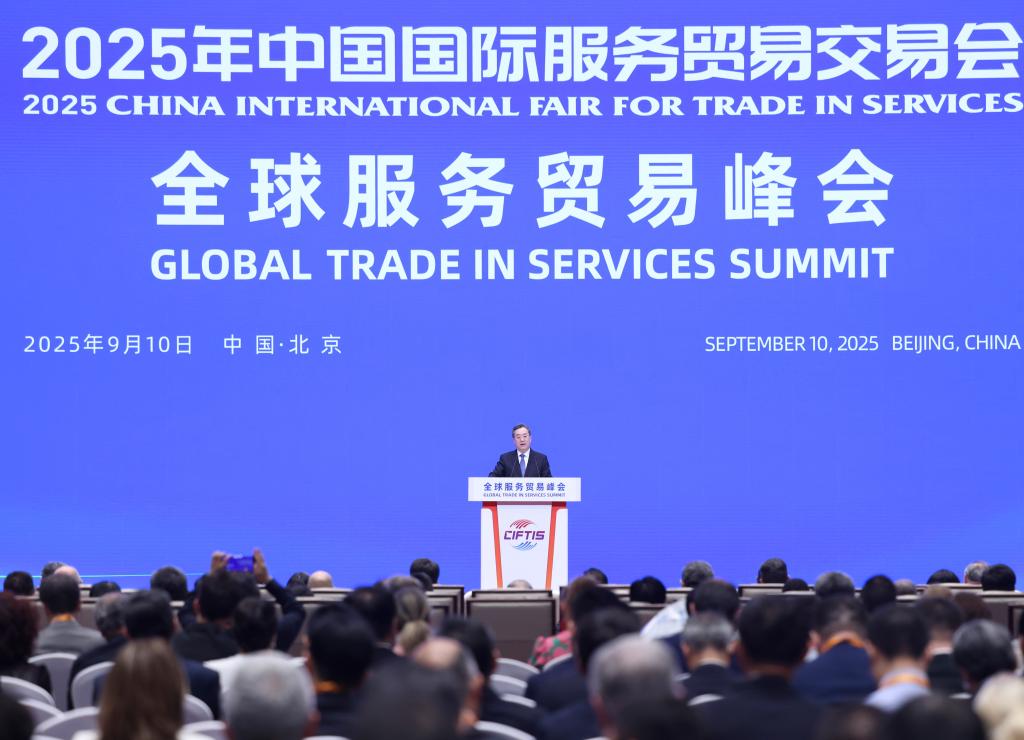 Ding Xuexiang, a member of the Standing Committee of the Political Bureau of the Communist Party of China Central Committee, and vice premier of the State Council, delivers a keynote speech at the Global Trade in Services Summit of the 2025 China International Fair for Trade in Services, in Beijing, capital of China, Sept. 10, 2025. (Xinhua/Ding Lin)