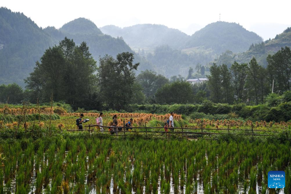 Ren Dabing (2nd L) and his students are on their way home after school in Wansen Village, Yajia Town, Songtao Miao Autonomous County, southwest China's Guizhou Province, Sept. 9, 2025. (Xinhua/Yang Wenbin)