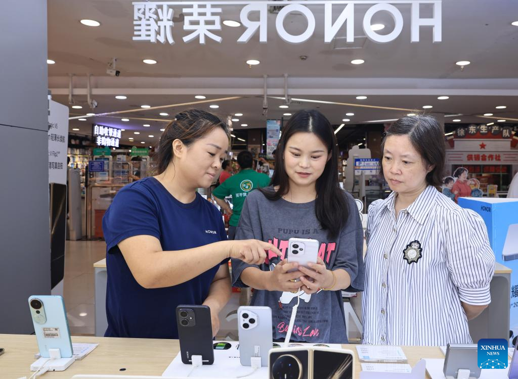 Consumers shop at a mobile phone dealer in Wuhan, central China's Hubei Province, Sept. 10, 2025. (Photo by Zhao Jun/Xinhua)
