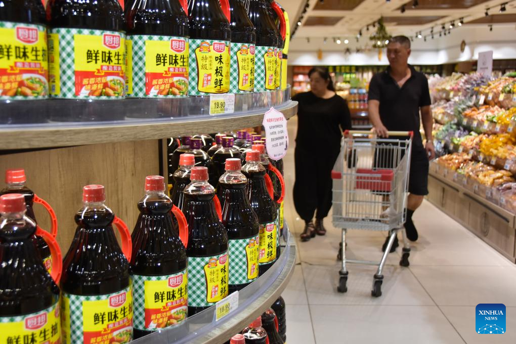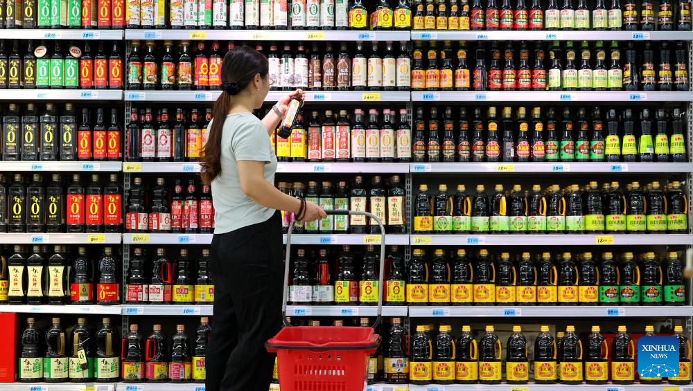 A consumer buys condiments at a supermarket in Zaozhuang, east China's Shandong Province, Sept. 10, 2025. (Photo by Sun Zhongzhe/Xinhua)