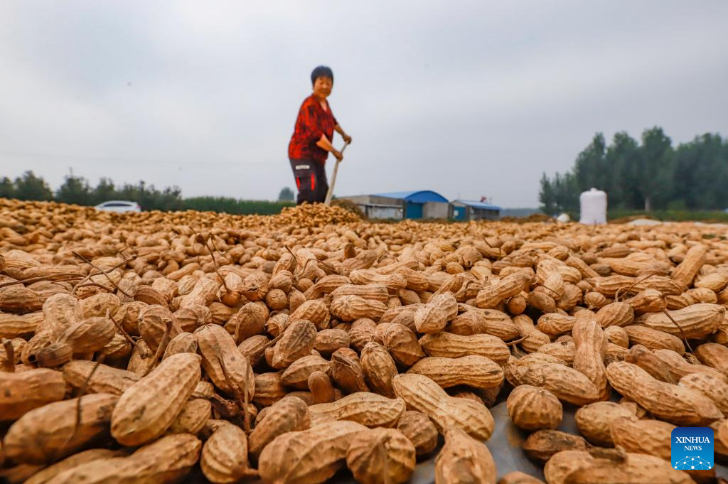 A villager airs peanuts in Dongxinzhuang Town of Zunhua City, north China's Hebei Province, Sept. 11, 2025. (Photo by Liu Mancang/Xinhua)