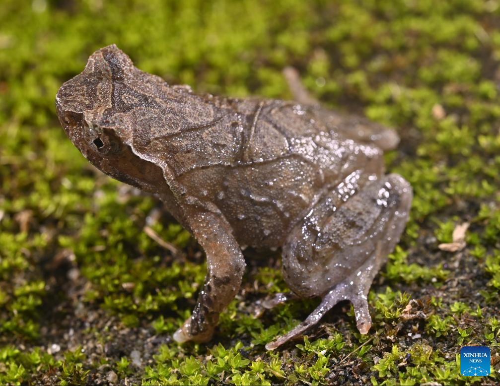 This file photo taken on Feb. 27, 2025 shows a male Boulenophrys huangniushiensis, a new horned toad species. Chinese researchers have discovered a new horned toad species in the Jiulianshan National Nature Reserve in east China's Jiangxi Province, according to the reserve. The new species, Boulenophrys huangniushiensis, is described in a study published online in the international journal Zootaxa on Wednesday. (Photo by Wu Xiaogang/Xinhua)