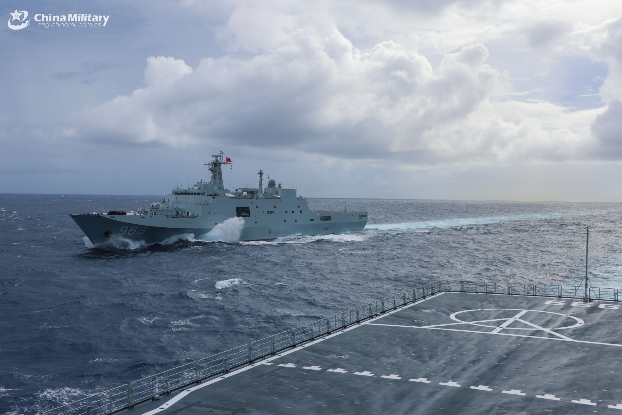 The amphibious dock landing ships Changbaishan (Hull 989) and Jinggangshan (Hull 999) attached to a naval landing ship flotilla under the Chinese PLA Southern Theater Command sail in formation during a maritime training exercise in the South China Sea in early September, 2025. (eng.chinamil.com.cn/Photo by Qiao Chenxi)