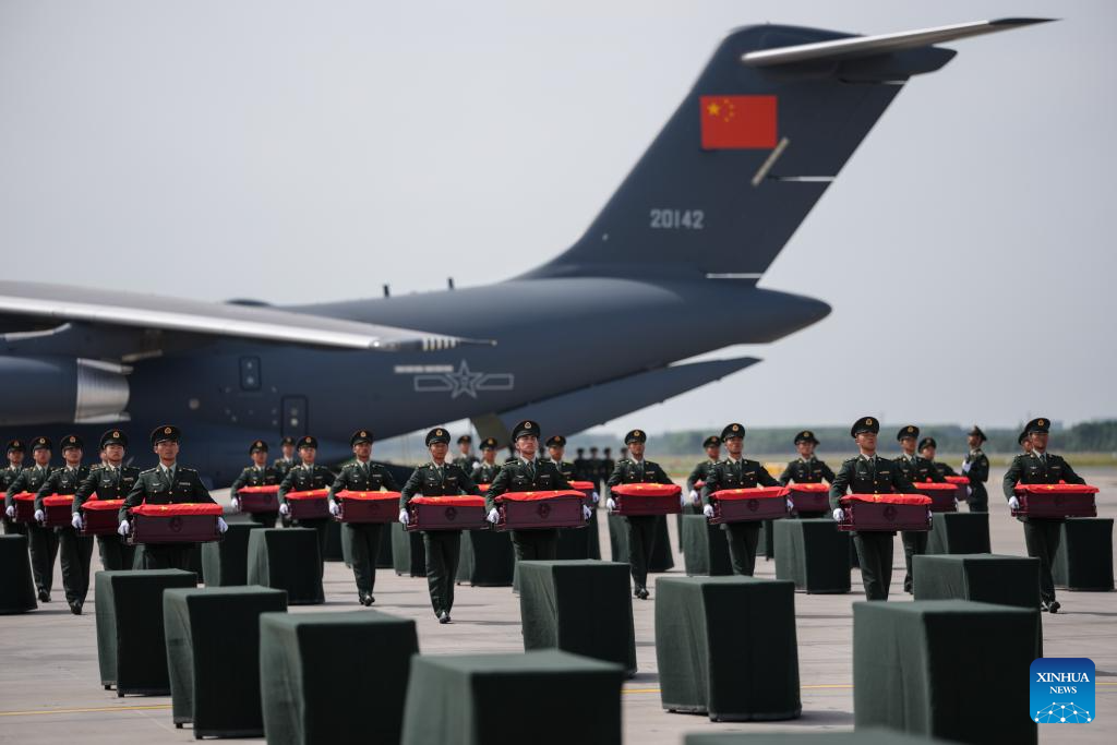A Chinese People's Liberation Army Air Force Y-20 transport aircraft, carrying the remains of the martyrs and 267 items of related artifacts, landed at Taoxian International Airport in Shenyang, capital of northeast China's Liaoning Province.