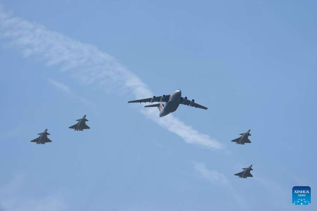 A Chinese People's Liberation Army (PLA) Air Force Y-20 transport aircraft carrying the remains of Chinese People's Volunteers (CPV) martyrs, escorted by four J-20 fighter jets, is pictured in Shenyang, capital of northeast China's Liaoning Province, on Sept. 12, 2025. The remains of 30 Chinese People's Volunteers (CPV) soldiers who lost their lives during the War to Resist U.S. Aggression and Aid Korea (1950-1953) were returned to China on Friday from the Republic of Korea (ROK). (Xinhua/Pan Yulong)
