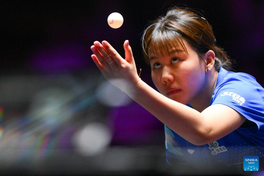 Chen Xingtong of China serves during the women's singles round of 16 match against Doo Hoi Kem of China's Hong Kong at the 2025 World Table Tennis (WTT) Champions Macao in Macao, south China, Sept. 12, 2025. (Xinhua/Cheong Kam Ka)