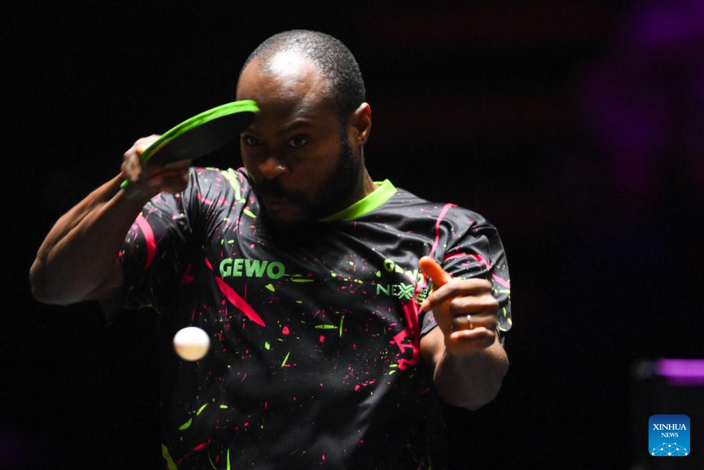 Quadri Aruna of Nigeria hits a return during the men's singles round of 16 match against Patrick Franziska of Germany at the 2025 World Table Tennis (WTT) Champions Macao in Macao, south China, Sept. 12, 2025. (Xinhua/Cheong Kam Ka)
