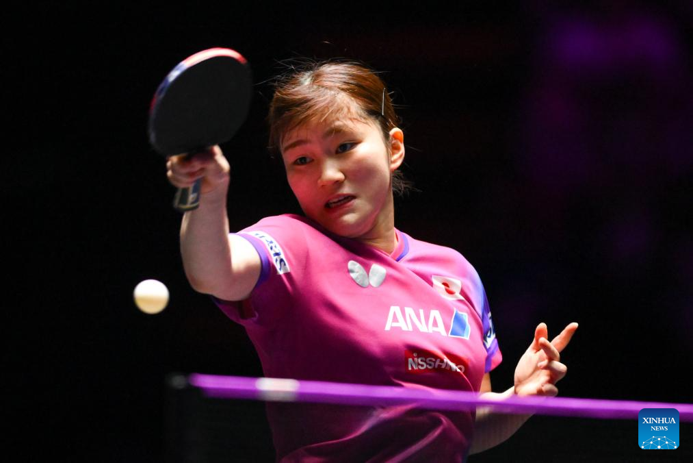 Harimoto Miwa of Japan hits a return during the women's singles round of 16 match against Odo Satsuki of Japan at the 2025 World Table Tennis (WTT) Champions Macao in Macao, south China, Sept. 12, 2025. (Xinhua/Cheong Kam Ka)
