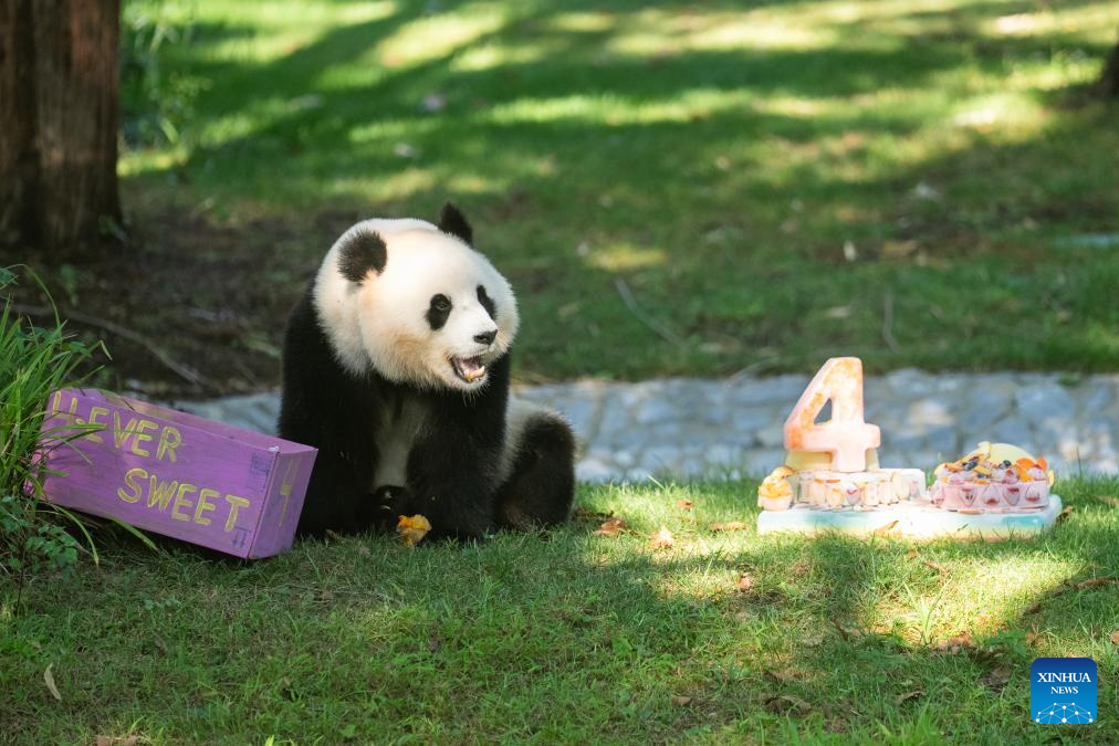 Giant panda Qing Bao eats the birthday cake during her fourth birthday's celebration at the Smithsonian's National Zoo in Washington, D.C., the United States, on Sept. 12, 2025. (Xinhua/Hu Yousong)