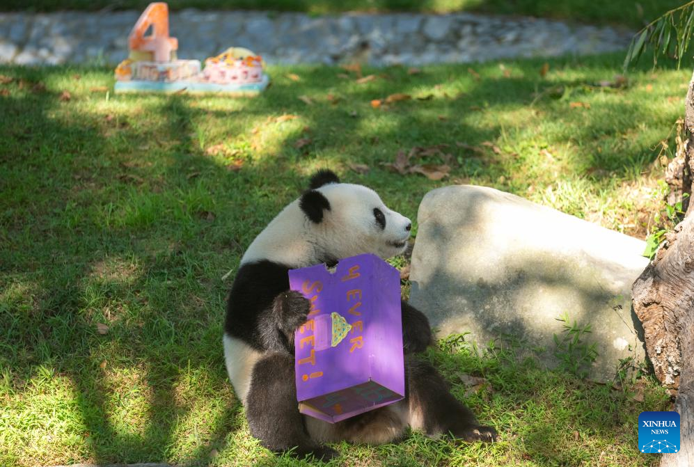 Giant panda Qing Bao plays during her fourth birthday's celebration at the Smithsonian's National Zoo in Washington, D.C., the United States, on Sept. 12, 2025. (Xinhua/Hu Yousong)