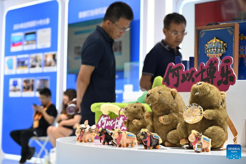 People view cultural and creative products displayed at the 2025 China International Fair for Trade in Services (CIFTIS) in Beijing, capital of China, Sept. 12, 2025. The 2025 CIFTIS is held from Sept. 10 to 14 at the Shougang Park in Beijing. This year's fair features a wide range of cultural and creative products, which are highly popular among visitors. (Xinhua/Sui Shangjun)