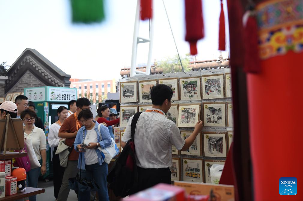 People view cultural and creative products displayed at the 2025 China International Fair for Trade in Services (CIFTIS) in Beijing, capital of China, Sept. 12, 2025. The 2025 CIFTIS is held from Sept. 10 to 14 at the Shougang Park in Beijing. This year's fair features a wide range of cultural and creative products, which are highly popular among visitors. (Xinhua/Zhang Xinjing)