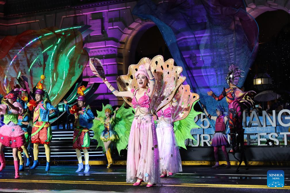 The launching ceremony of the 36th Shanghai Tourism Festival floats parade was held in Huangpu District of Shanghai on Saturday. A total of 25 floats and 24 performing teams from 15 countries and regions took part in the parade. (Xinhua/Fang Zhe)