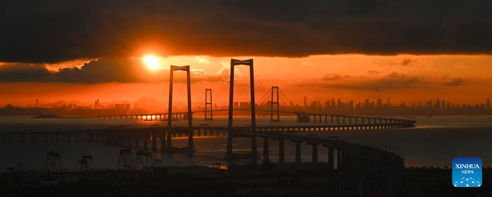 This stitched photo taken on Sept. 14, 2025 shows a section of the Shenzhen-Zhongshan link at sunrise in south China's Guangdong Province. (Xinhua/Deng Hua)