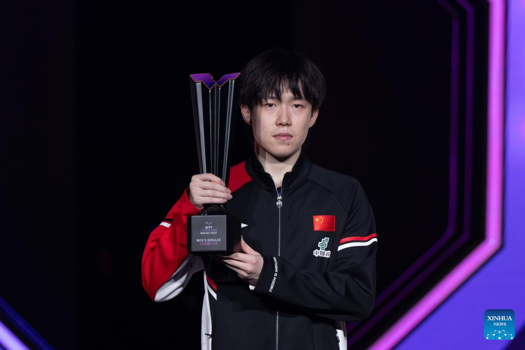 Wang Chuqin of China poses during the trophy presentation after the men's singles final match between Wang Chuqin of China and Hugo Calderano of Brazil at the 2025 World Table Tennis (WTT) Champions Macao in Macao, south China, Sept. 14, 2025. (Xinhua/Cheong Kam Ka)