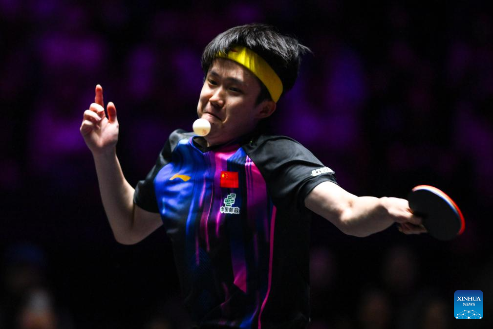 Wang Chuqin of China competes during the men's singles final match between Wang Chuqin of China and Hugo Calderano of Brazil at the 2025 World Table Tennis (WTT) Champions Macao in Macao, south China, Sept. 14, 2025. (Xinhua/Cheong Kam Ka)