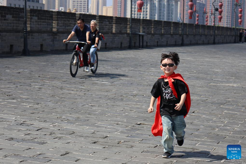 A child runs on the ancient city wall in Xi'an, northwest China's Shaanxi Province, Sept. 12, 2025. The 13.74-kilometer-long ancient city wall that surrounds Xi'an is one of the longest and best-preserved of its kind in China. A digital comprehensive management platform has been built for the wall since 2023, which integrates functions such as cultural relic protection, cultural tourism operation, emergency management, and flood-control command.